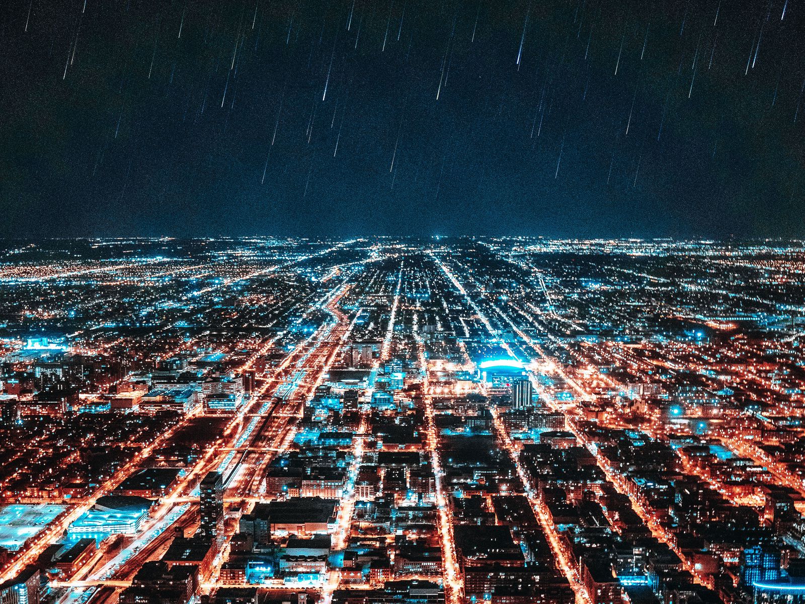 Download 1600x1200 city, neighborhoods, perspective, light, electricity, shining, stars wallpaper, background standard 4:3