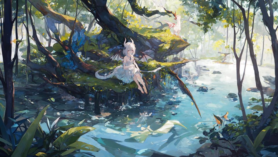 Download 960x544 girl, horns, tail, tree, river, anime wallpaper, background playstation ps vita