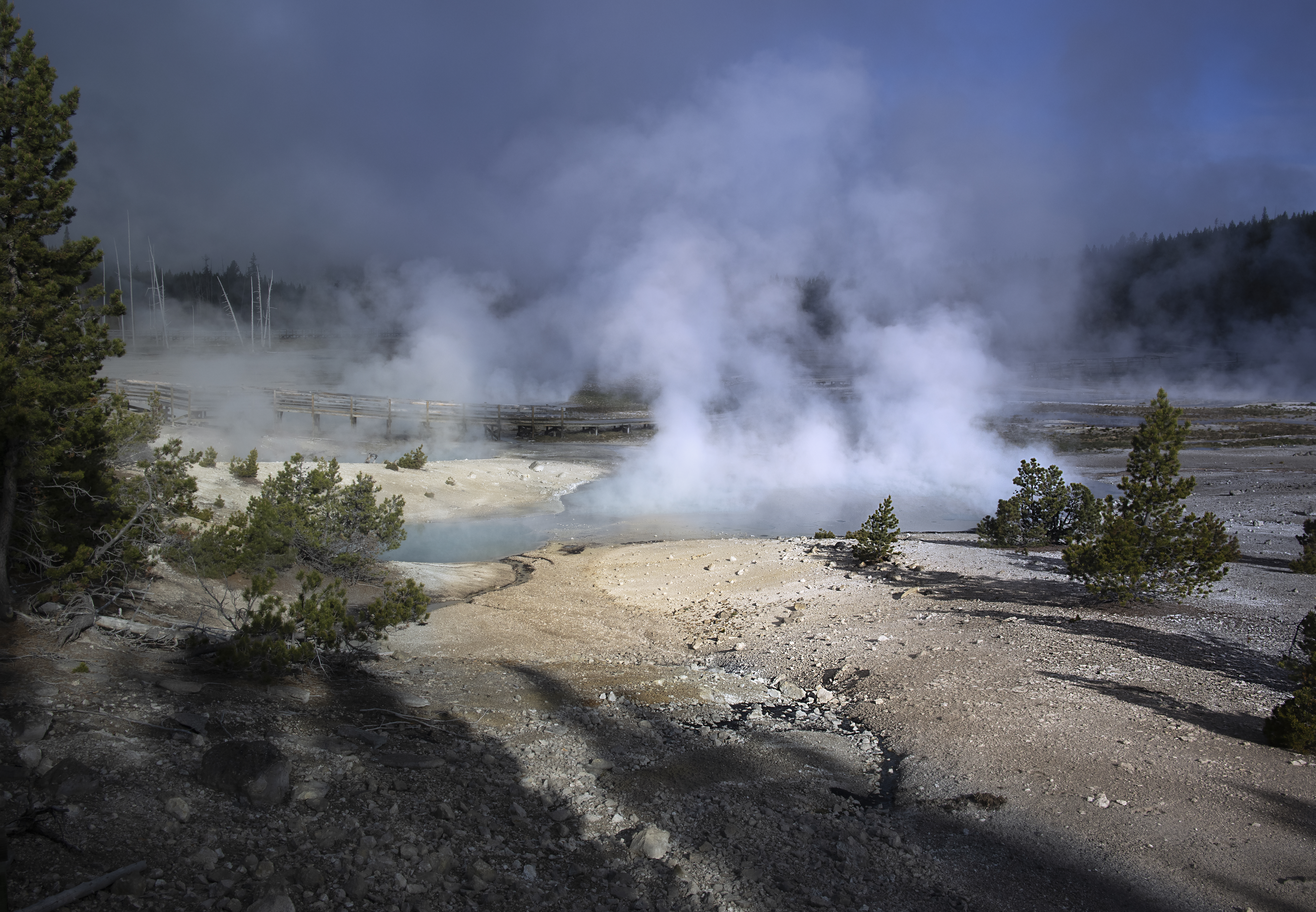 Download 9363x6488 trees, smoke, steam, lake, sources, nature wallpaper, background