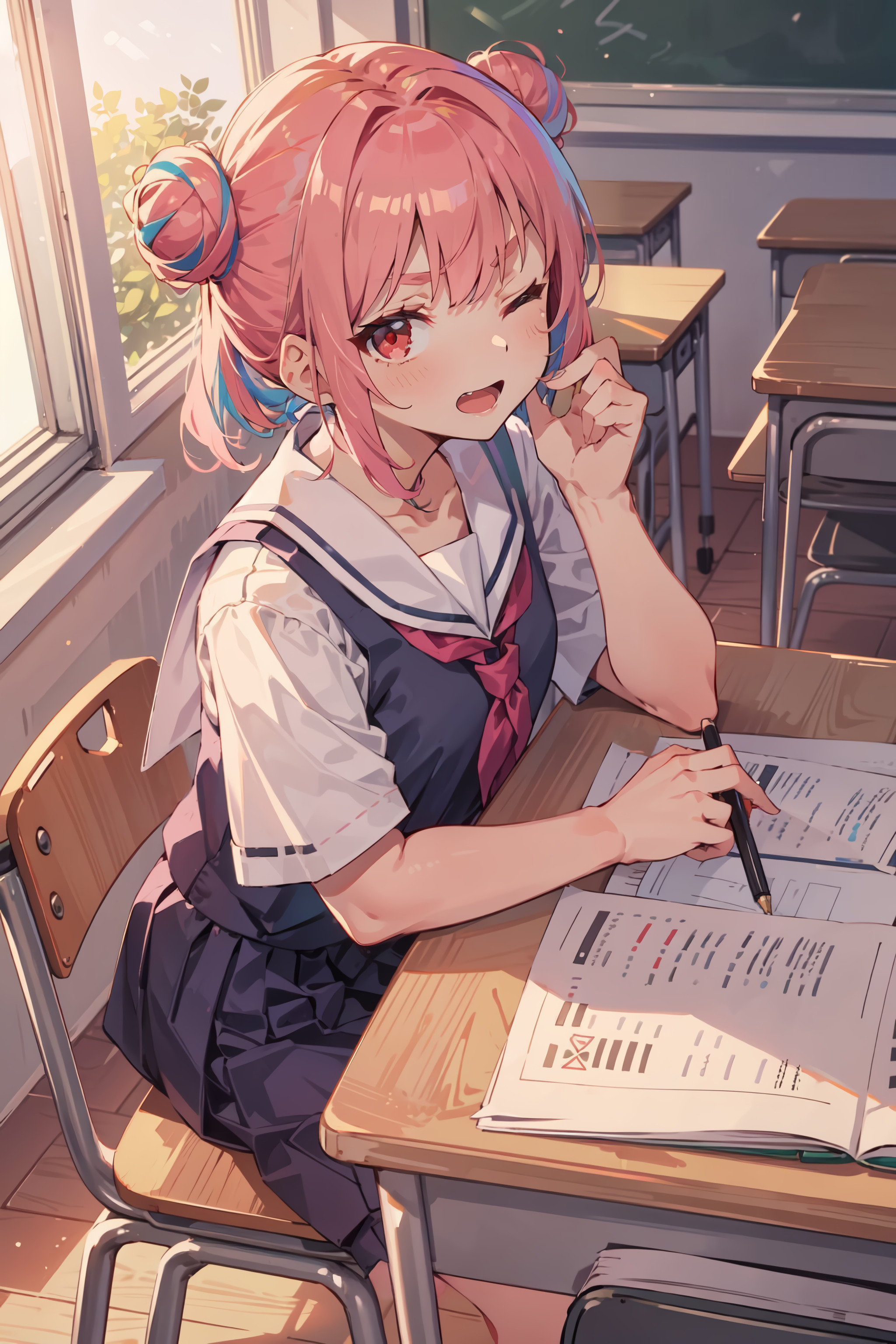 Download 2048x3072 girl, schoolgirl, smile, desk, anime, art wallpaper, background