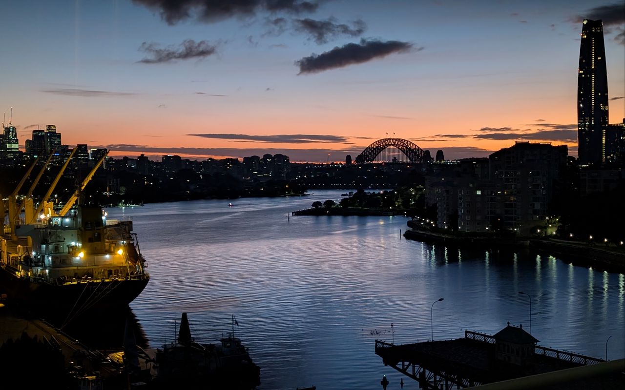 Download 1280x800 river, ship, bridge, city, sunset, dark wallpaper, background widescreen 16:10
